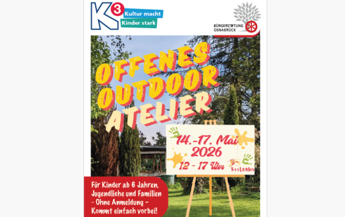 Im Rahmen des K3-Projektes der Bürgerstiftung Osnabrück lädt Jessica Fleming zum Offenen Outdoor-Atelier für Kinder ab 6 Jahren ein. Das Projekt findet an vier Tagen vom 14. bis ...