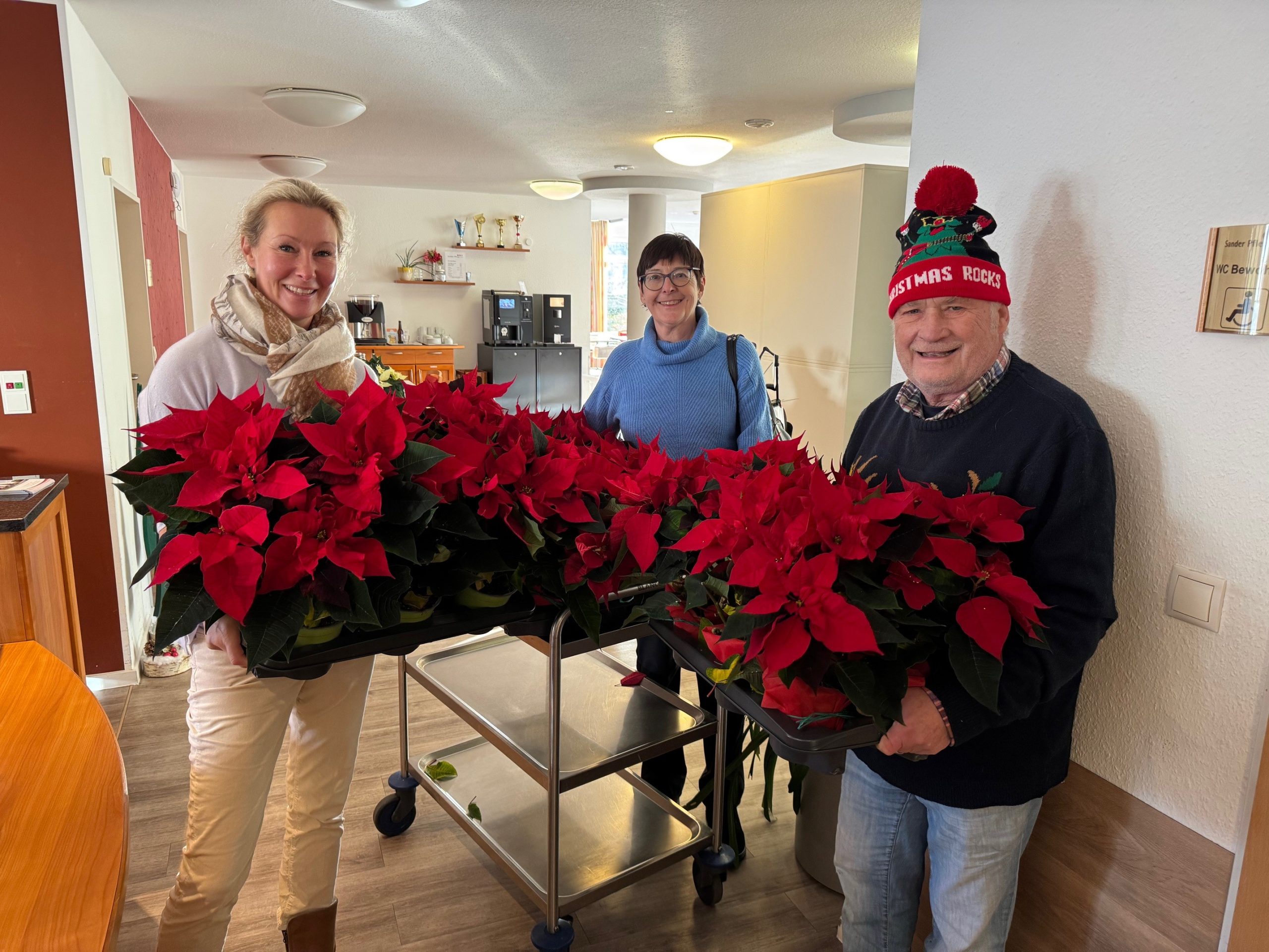 Manchmal sind es die kleinen Dinge, die eine große Freude bringen- mit viel Herz und Humor übergaben Miriam Sievert und Heike Walter aus dem Vorstand der Bürgerstiftung Osnabrück sowie Thomas Schenk, Projektleiter des Projektes „Gut essen im Abseits“ 45 Weihnachtssterne an die Senioren des SSB in Eversburg.