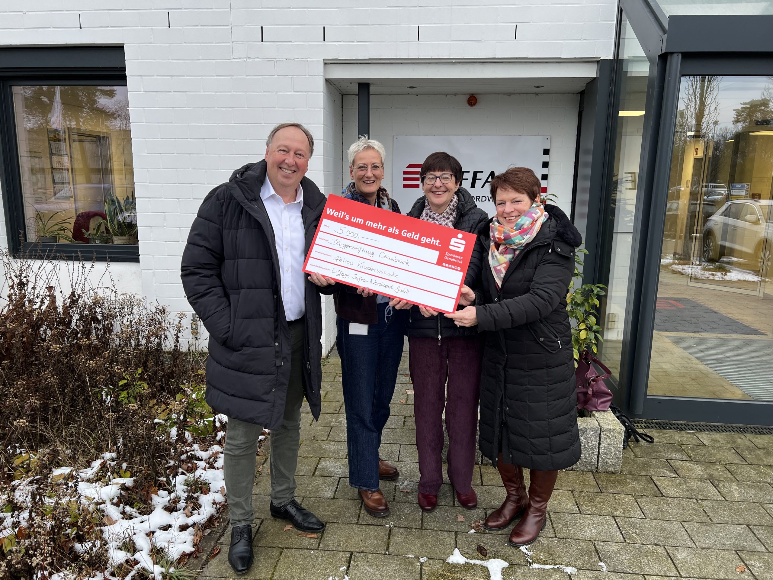 Dankbar nahmen Ulrike Burghardt, die Vorsitzende der Bürgerstiftung Osnabrück und Heike Walter, die Projektleiterin des Projektes Kinderwünsche, die großzügige Weihnachtsspende der Firma Eiffage in Wallenhorst über 5000 € für die Aktion Weihnachtswünsche entgegen.