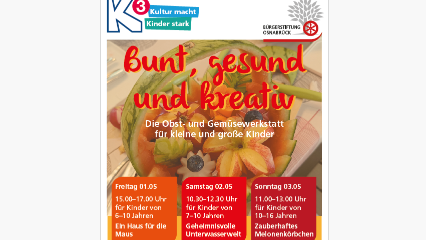 Im Rahmen des K3-Projektes der Bürgerstiftung Osnabrück lädt Anke Bergmann in die FunnyFood Obst- und Gemüsewerkstatt für kleine und ...