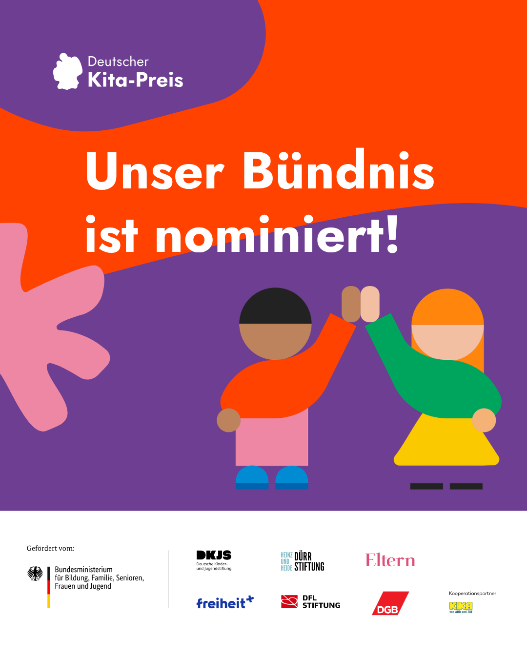 Der Deutsche Kita-Preis ist eine gemeinsame Initiative des Bundesministeriums für Bildung, Familie, Senioren, Frauen und Jugend und der Deutschen Kinder- und Jugendstiftung in Partnerschaft mit dem Deutschen Gewerkschaftsbund, der DFL Stiftung, der Marke ELTERN, der Heinz und Heide Dürr Stiftung und der Soziallotterie freiheit+. Die Auszeichnung setzt Impulse für Qualität in der frühkindlichen Bildung und würdigt das Engagement der Menschen, die tagtäglich in Kitas und lokalen Bündnissen zeigen, wie gute Qualität vor Ort gelingt. www.deutscher-kita-preis.de