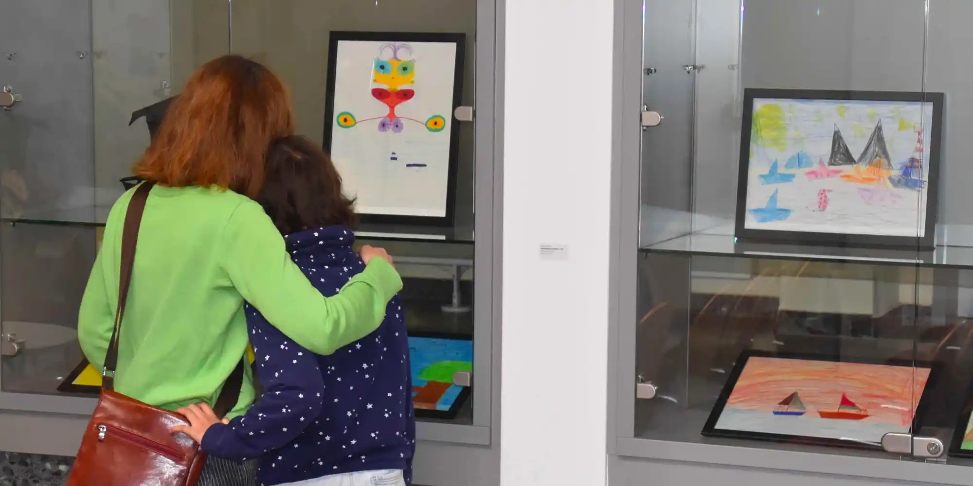 In den Glasvitrinen sind Bilder und Objekte ausgestellt, die die Themen der Kurse aufnehmen und wiedergeben. Jedes Bild, das aus Imagination und Emotionen entstanden ist, ist eine ganz individuelles Kinder-Kunst-Werk.