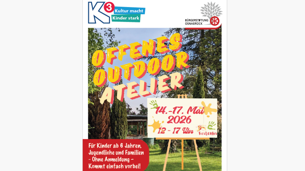 Im Rahmen des K3-Projektes der Bürgerstiftung Osnabrück lädt Jessica Fleming zum Offenen Outdoor-Atelier für Kinder ab 6 Jahren ein.