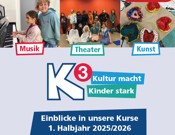 Außerdem finden in Kinder- und Jugendtreffs sowie verschiedenen Kulturorten K 3 – Kurse statt. Mit diesem Projekt erhalten Kinder und Jugendliche in wöchentlichen Kursen die Chance kultureller Teilhabe und Bildung in den Sparten Kunst, Theater oder Musik.